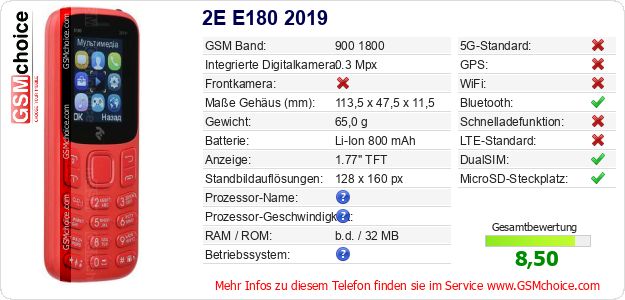 Hast du eigene Webseite? Willst du die Informationen über Standarddaten des Handys 2E E180 2019 irgendwo veröffentlichen? Das ist sehr einfach. Du kannst das Bild herunterladen oder kopieren und auf der Webseite folgenden Code hinzufügen:Das Einfügen von diesem Code verursacht das Anzeigen von dem folgenden Bild: