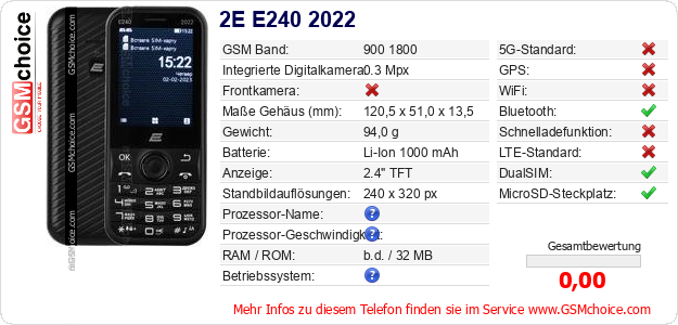 Hast du eigene Webseite? Willst du die Informationen über Standarddaten des Handys 2E E240 2022 irgendwo veröffentlichen? Das ist sehr einfach. Du kannst das Bild herunterladen oder kopieren und auf der Webseite folgenden Code hinzufügen:Das Einfügen von diesem Code verursacht das Anzeigen von dem folgenden Bild: