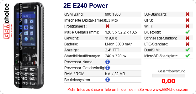 Hast du eigene Webseite? Willst du die Informationen über Standarddaten des Handys 2E E240 Power irgendwo veröffentlichen? Das ist sehr einfach. Du kannst das Bild herunterladen oder kopieren und auf der Webseite folgenden Code hinzufügen:Das Einfügen von diesem Code verursacht das Anzeigen von dem folgenden Bild: