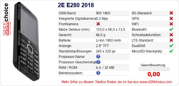 Hast du eigene Webseite? Willst du die Informationen über Standarddaten des Handys 2E E280 2018 irgendwo veröffentlichen? Das ist sehr einfach. Du kannst das Bild herunterladen oder kopieren und auf der Webseite folgenden Code hinzufügen:Das Einfügen von diesem Code verursacht das Anzeigen von dem folgenden Bild: