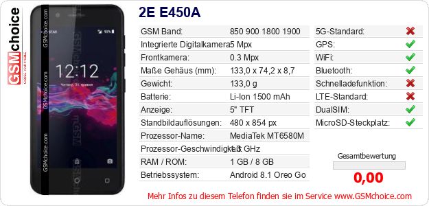 Hast du eigene Webseite? Willst du die Informationen über Standarddaten des Handys 2E E450A irgendwo veröffentlichen? Das ist sehr einfach. Du kannst das Bild herunterladen oder kopieren und auf der Webseite folgenden Code hinzufügen:Das Einfügen von diesem Code verursacht das Anzeigen von dem folgenden Bild: