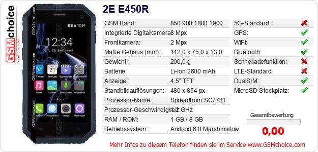 Hast du eigene Webseite? Willst du die Informationen über Standarddaten des Handys 2E E450R irgendwo veröffentlichen? Das ist sehr einfach. Du kannst das Bild herunterladen oder kopieren und auf der Webseite folgenden Code hinzufügen:Das Einfügen von diesem Code verursacht das Anzeigen von dem folgenden Bild: