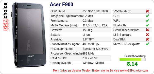 Hast du eigene Webseite? Willst du die Informationen über Standarddaten des Handys Acer F900 irgendwo veröffentlichen? Das ist sehr einfach. Du kannst das Bild herunterladen oder kopieren und auf der Webseite folgenden Code hinzufügen:Das Einfügen von diesem Code verursacht das Anzeigen von dem folgenden Bild: