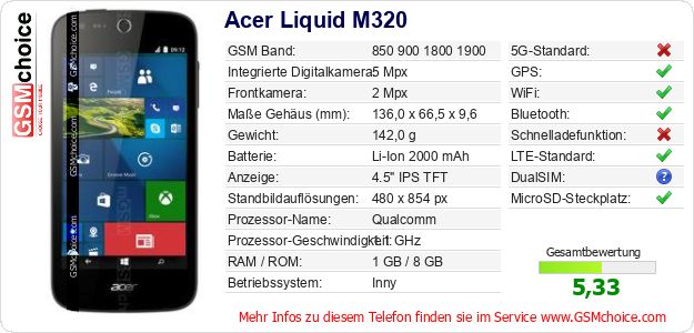 Hast du eigene Webseite? Willst du die Informationen über Standarddaten des Handys Acer Liquid M320 irgendwo veröffentlichen? Das ist sehr einfach. Du kannst das Bild herunterladen oder kopieren und auf der Webseite folgenden Code hinzufügen:Das Einfügen von diesem Code verursacht das Anzeigen von dem folgenden Bild: