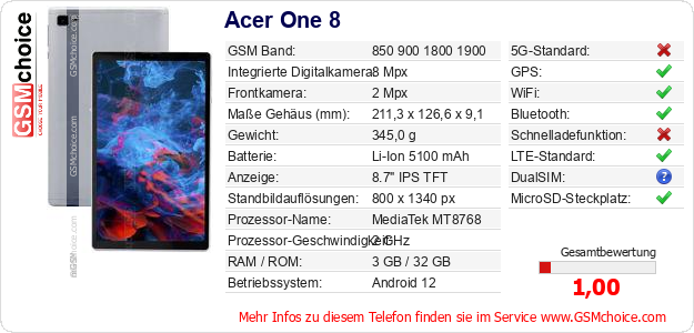 Hast du eigene Webseite? Willst du die Informationen über Standarddaten des Handys Acer One 8 irgendwo veröffentlichen? Das ist sehr einfach. Du kannst das Bild herunterladen oder kopieren und auf der Webseite folgenden Code hinzufügen:Das Einfügen von diesem Code verursacht das Anzeigen von dem folgenden Bild: