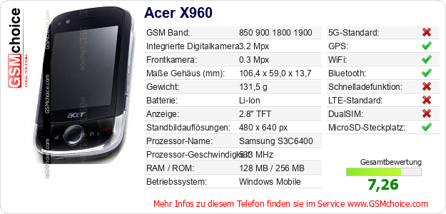 Hast du eigene Webseite? Willst du die Informationen über Standarddaten des Handys Acer X960 irgendwo veröffentlichen? Das ist sehr einfach. Du kannst das Bild herunterladen oder kopieren und auf der Webseite folgenden Code hinzufügen:Das Einfügen von diesem Code verursacht das Anzeigen von dem folgenden Bild:
