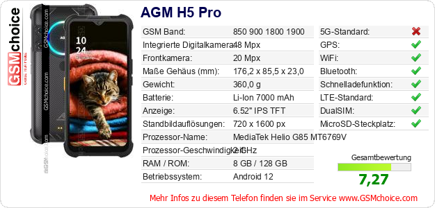 Hast du eigene Webseite? Willst du die Informationen über Standarddaten des Handys AGM H5 Pro irgendwo veröffentlichen? Das ist sehr einfach. Du kannst das Bild herunterladen oder kopieren und auf der Webseite folgenden Code hinzufügen:Das Einfügen von diesem Code verursacht das Anzeigen von dem folgenden Bild: