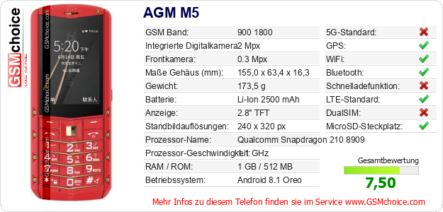 Hast du eigene Webseite? Willst du die Informationen über Standarddaten des Handys AGM M5 irgendwo veröffentlichen? Das ist sehr einfach. Du kannst das Bild herunterladen oder kopieren und auf der Webseite folgenden Code hinzufügen:Das Einfügen von diesem Code verursacht das Anzeigen von dem folgenden Bild: