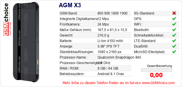 Hast du eigene Webseite? Willst du die Informationen über Standarddaten des Handys AGM X3 irgendwo veröffentlichen? Das ist sehr einfach. Du kannst das Bild herunterladen oder kopieren und auf der Webseite folgenden Code hinzufügen:Das Einfügen von diesem Code verursacht das Anzeigen von dem folgenden Bild: