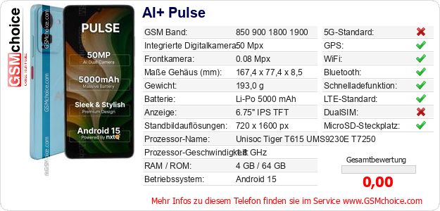 Hast du eigene Webseite? Willst du die Informationen über Standarddaten des Handys AI+ Pulse irgendwo veröffentlichen? Das ist sehr einfach. Du kannst das Bild herunterladen oder kopieren und auf der Webseite folgenden Code hinzufügen:Das Einfügen von diesem Code verursacht das Anzeigen von dem folgenden Bild: