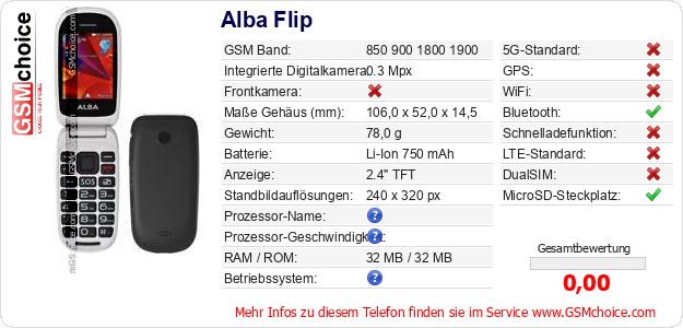 Hast du eigene Webseite? Willst du die Informationen über Standarddaten des Handys Alba Flip irgendwo veröffentlichen? Das ist sehr einfach. Du kannst das Bild herunterladen oder kopieren und auf der Webseite folgenden Code hinzufügen:Das Einfügen von diesem Code verursacht das Anzeigen von dem folgenden Bild: