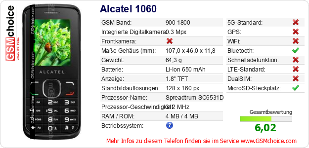 Hast du eigene Webseite? Willst du die Informationen über Standarddaten des Handys Alcatel 1060 irgendwo veröffentlichen? Das ist sehr einfach. Du kannst das Bild herunterladen oder kopieren und auf der Webseite folgenden Code hinzufügen:Das Einfügen von diesem Code verursacht das Anzeigen von dem folgenden Bild: