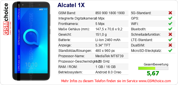 Hast du eigene Webseite? Willst du die Informationen über Standarddaten des Handys Alcatel 1X irgendwo veröffentlichen? Das ist sehr einfach. Du kannst das Bild herunterladen oder kopieren und auf der Webseite folgenden Code hinzufügen:Das Einfügen von diesem Code verursacht das Anzeigen von dem folgenden Bild: