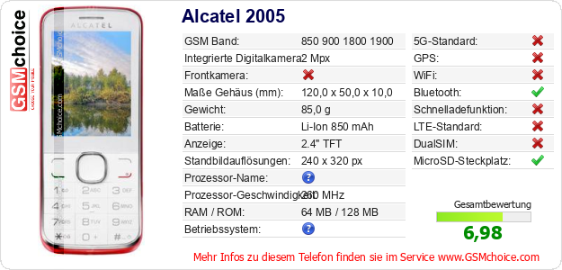 Hast du eigene Webseite? Willst du die Informationen über Standarddaten des Handys Alcatel 2005 irgendwo veröffentlichen? Das ist sehr einfach. Du kannst das Bild herunterladen oder kopieren und auf der Webseite folgenden Code hinzufügen:Das Einfügen von diesem Code verursacht das Anzeigen von dem folgenden Bild: