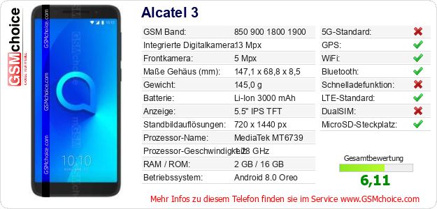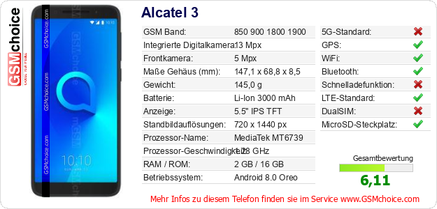 Hast du eigene Webseite? Willst du die Informationen über Standarddaten des Handys Alcatel 3 irgendwo veröffentlichen? Das ist sehr einfach. Du kannst das Bild herunterladen oder kopieren und auf der Webseite folgenden Code hinzufügen:Das Einfügen von diesem Code verursacht das Anzeigen von dem folgenden Bild: