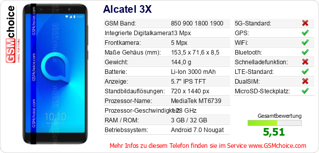 Hast du eigene Webseite? Willst du die Informationen über Standarddaten des Handys Alcatel 3X irgendwo veröffentlichen? Das ist sehr einfach. Du kannst das Bild herunterladen oder kopieren und auf der Webseite folgenden Code hinzufügen:Das Einfügen von diesem Code verursacht das Anzeigen von dem folgenden Bild: