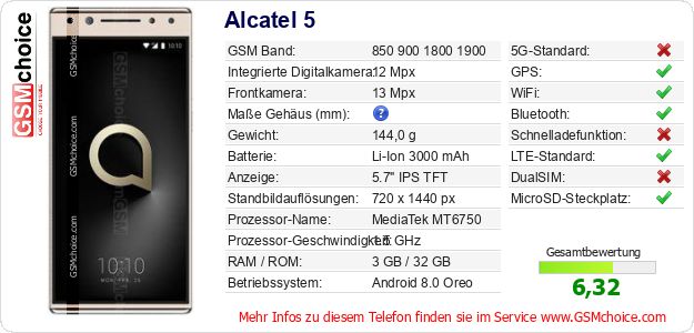 Hast du eigene Webseite? Willst du die Informationen über Standarddaten des Handys Alcatel 5 irgendwo veröffentlichen? Das ist sehr einfach. Du kannst das Bild herunterladen oder kopieren und auf der Webseite folgenden Code hinzufügen:Das Einfügen von diesem Code verursacht das Anzeigen von dem folgenden Bild: