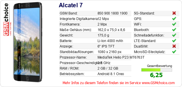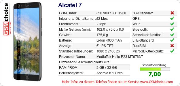 Hast du eigene Webseite? Willst du die Informationen über Standarddaten des Handys Alcatel 7 irgendwo veröffentlichen? Das ist sehr einfach. Du kannst das Bild herunterladen oder kopieren und auf der Webseite folgenden Code hinzufügen:Das Einfügen von diesem Code verursacht das Anzeigen von dem folgenden Bild: