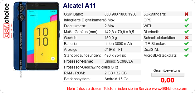 Hast du eigene Webseite? Willst du die Informationen über Standarddaten des Handys Alcatel A11 irgendwo veröffentlichen? Das ist sehr einfach. Du kannst das Bild herunterladen oder kopieren und auf der Webseite folgenden Code hinzufügen:Das Einfügen von diesem Code verursacht das Anzeigen von dem folgenden Bild: