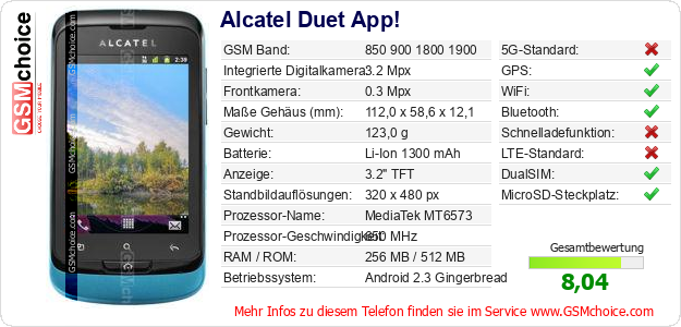 Hast du eigene Webseite? Willst du die Informationen über Standarddaten des Handys Alcatel Duet App! irgendwo veröffentlichen? Das ist sehr einfach. Du kannst das Bild herunterladen oder kopieren und auf der Webseite folgenden Code hinzufügen:Das Einfügen von diesem Code verursacht das Anzeigen von dem folgenden Bild: