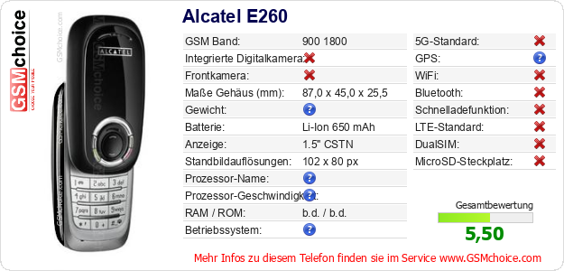 Hast du eigene Webseite? Willst du die Informationen über Standarddaten des Handys Alcatel E260 irgendwo veröffentlichen? Das ist sehr einfach. Du kannst das Bild herunterladen oder kopieren und auf der Webseite folgenden Code hinzufügen:Das Einfügen von diesem Code verursacht das Anzeigen von dem folgenden Bild: