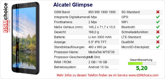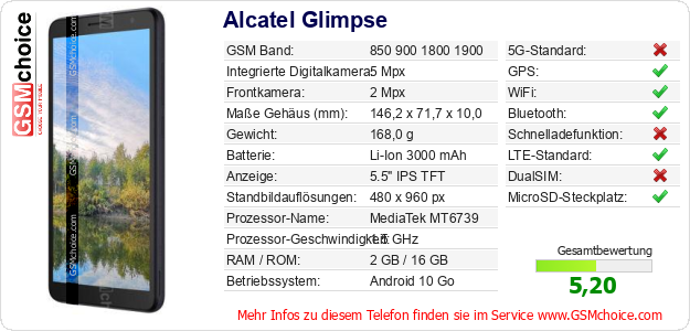Hast du eigene Webseite? Willst du die Informationen über Standarddaten des Handys Alcatel Glimpse irgendwo veröffentlichen? Das ist sehr einfach. Du kannst das Bild herunterladen oder kopieren und auf der Webseite folgenden Code hinzufügen:Das Einfügen von diesem Code verursacht das Anzeigen von dem folgenden Bild: