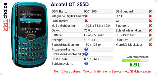 Hast du eigene Webseite? Willst du die Informationen über Standarddaten des Handys Alcatel OT 255D irgendwo veröffentlichen? Das ist sehr einfach. Du kannst das Bild herunterladen oder kopieren und auf der Webseite folgenden Code hinzufügen:Das Einfügen von diesem Code verursacht das Anzeigen von dem folgenden Bild: