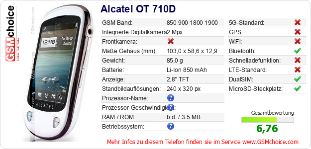 Hast du eigene Webseite? Willst du die Informationen über Standarddaten des Handys Alcatel OT 710D irgendwo veröffentlichen? Das ist sehr einfach. Du kannst das Bild herunterladen oder kopieren und auf der Webseite folgenden Code hinzufügen:Das Einfügen von diesem Code verursacht das Anzeigen von dem folgenden Bild: