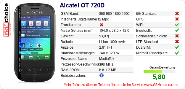 Hast du eigene Webseite? Willst du die Informationen über Standarddaten des Handys Alcatel OT 720D irgendwo veröffentlichen? Das ist sehr einfach. Du kannst das Bild herunterladen oder kopieren und auf der Webseite folgenden Code hinzufügen:Das Einfügen von diesem Code verursacht das Anzeigen von dem folgenden Bild: