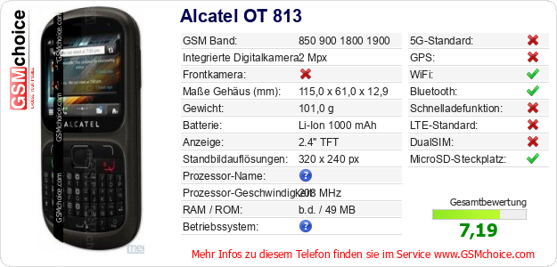 Hast du eigene Webseite? Willst du die Informationen über Standarddaten des Handys Alcatel OT 813 irgendwo veröffentlichen? Das ist sehr einfach. Du kannst das Bild herunterladen oder kopieren und auf der Webseite folgenden Code hinzufügen:Das Einfügen von diesem Code verursacht das Anzeigen von dem folgenden Bild: