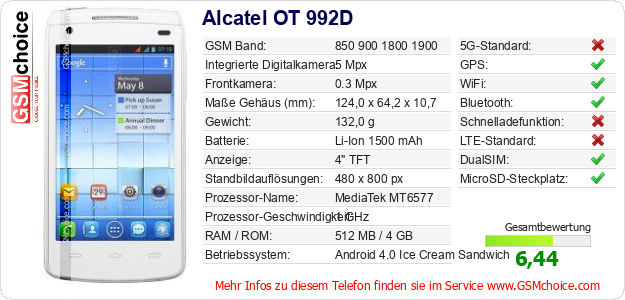 Hast du eigene Webseite? Willst du die Informationen über Standarddaten des Handys Alcatel OT 992D irgendwo veröffentlichen? Das ist sehr einfach. Du kannst das Bild herunterladen oder kopieren und auf der Webseite folgenden Code hinzufügen:Das Einfügen von diesem Code verursacht das Anzeigen von dem folgenden Bild:
