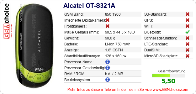 Hast du eigene Webseite? Willst du die Informationen über Standarddaten des Handys Alcatel OT-S321A irgendwo veröffentlichen? Das ist sehr einfach. Du kannst das Bild herunterladen oder kopieren und auf der Webseite folgenden Code hinzufügen:Das Einfügen von diesem Code verursacht das Anzeigen von dem folgenden Bild: