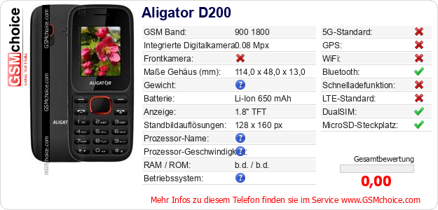 Hast du eigene Webseite? Willst du die Informationen über Standarddaten des Handys Aligator D200 irgendwo veröffentlichen? Das ist sehr einfach. Du kannst das Bild herunterladen oder kopieren und auf der Webseite folgenden Code hinzufügen:Das Einfügen von diesem Code verursacht das Anzeigen von dem folgenden Bild: