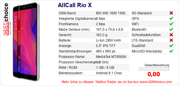 Hast du eigene Webseite? Willst du die Informationen über Standarddaten des Handys AllCall Rio X irgendwo veröffentlichen? Das ist sehr einfach. Du kannst das Bild herunterladen oder kopieren und auf der Webseite folgenden Code hinzufügen:Das Einfügen von diesem Code verursacht das Anzeigen von dem folgenden Bild: