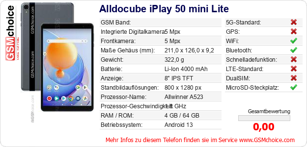 Hast du eigene Webseite? Willst du die Informationen über Standarddaten des Handys Alldocube iPlay 50 mini Lite irgendwo veröffentlichen? Das ist sehr einfach. Du kannst das Bild herunterladen oder kopieren und auf der Webseite folgenden Code hinzufügen:Das Einfügen von diesem Code verursacht das Anzeigen von dem folgenden Bild: