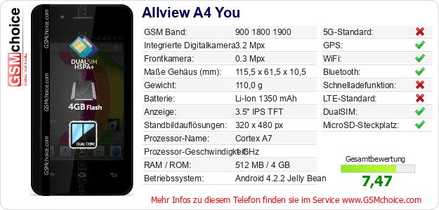 Hast du eigene Webseite? Willst du die Informationen über Standarddaten des Handys Allview A4 You irgendwo veröffentlichen? Das ist sehr einfach. Du kannst das Bild herunterladen oder kopieren und auf der Webseite folgenden Code hinzufügen:Das Einfügen von diesem Code verursacht das Anzeigen von dem folgenden Bild: