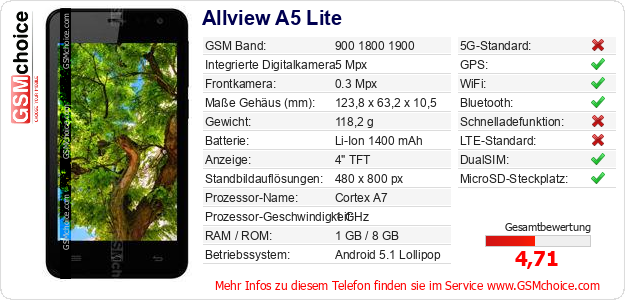 Hast du eigene Webseite? Willst du die Informationen über Standarddaten des Handys Allview A5 Lite irgendwo veröffentlichen? Das ist sehr einfach. Du kannst das Bild herunterladen oder kopieren und auf der Webseite folgenden Code hinzufügen:Das Einfügen von diesem Code verursacht das Anzeigen von dem folgenden Bild:
