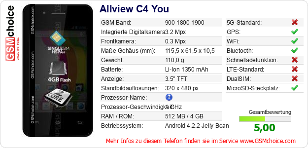 Hast du eigene Webseite? Willst du die Informationen über Standarddaten des Handys Allview C4 You irgendwo veröffentlichen? Das ist sehr einfach. Du kannst das Bild herunterladen oder kopieren und auf der Webseite folgenden Code hinzufügen:Das Einfügen von diesem Code verursacht das Anzeigen von dem folgenden Bild: