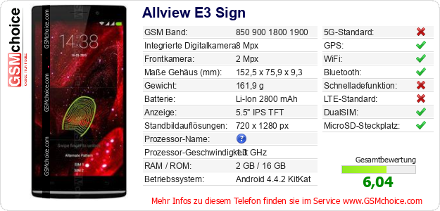 Hast du eigene Webseite? Willst du die Informationen über Standarddaten des Handys Allview E3 Sign irgendwo veröffentlichen? Das ist sehr einfach. Du kannst das Bild herunterladen oder kopieren und auf der Webseite folgenden Code hinzufügen:Das Einfügen von diesem Code verursacht das Anzeigen von dem folgenden Bild:
