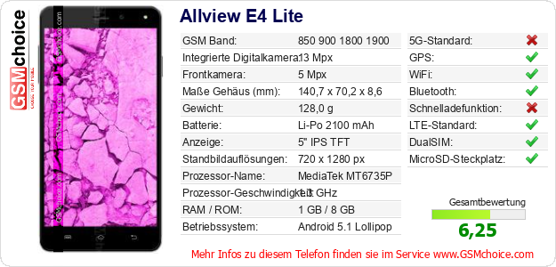 Hast du eigene Webseite? Willst du die Informationen über Standarddaten des Handys Allview E4 Lite irgendwo veröffentlichen? Das ist sehr einfach. Du kannst das Bild herunterladen oder kopieren und auf der Webseite folgenden Code hinzufügen:Das Einfügen von diesem Code verursacht das Anzeigen von dem folgenden Bild: