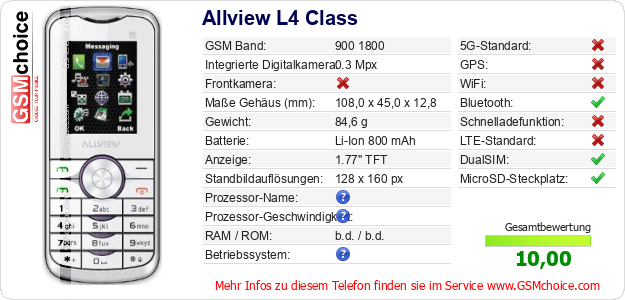 Hast du eigene Webseite? Willst du die Informationen über Standarddaten des Handys Allview L4 Class irgendwo veröffentlichen? Das ist sehr einfach. Du kannst das Bild herunterladen oder kopieren und auf der Webseite folgenden Code hinzufügen:Das Einfügen von diesem Code verursacht das Anzeigen von dem folgenden Bild:
