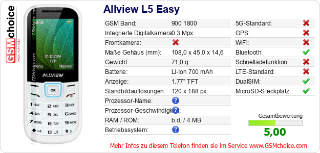 Hast du eigene Webseite? Willst du die Informationen über Standarddaten des Handys Allview L5 Easy irgendwo veröffentlichen? Das ist sehr einfach. Du kannst das Bild herunterladen oder kopieren und auf der Webseite folgenden Code hinzufügen:Das Einfügen von diesem Code verursacht das Anzeigen von dem folgenden Bild: