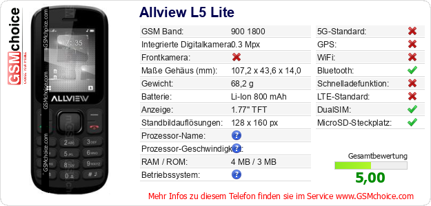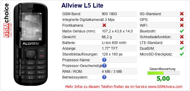 Hast du eigene Webseite? Willst du die Informationen über Standarddaten des Handys Allview L5 Lite irgendwo veröffentlichen? Das ist sehr einfach. Du kannst das Bild herunterladen oder kopieren und auf der Webseite folgenden Code hinzufügen:Das Einfügen von diesem Code verursacht das Anzeigen von dem folgenden Bild: