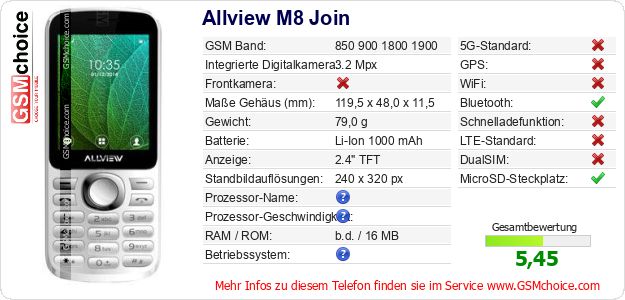 Hast du eigene Webseite? Willst du die Informationen über Standarddaten des Handys Allview M8 Join irgendwo veröffentlichen? Das ist sehr einfach. Du kannst das Bild herunterladen oder kopieren und auf der Webseite folgenden Code hinzufügen:Das Einfügen von diesem Code verursacht das Anzeigen von dem folgenden Bild: