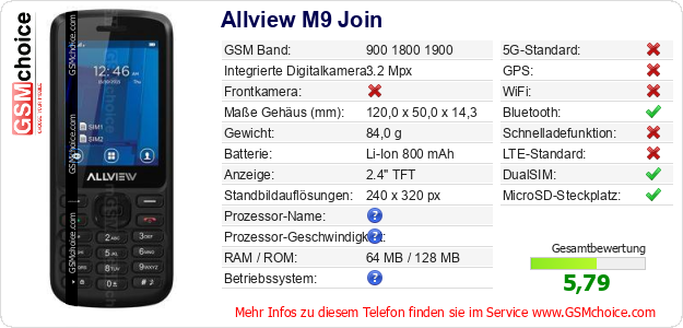 Hast du eigene Webseite? Willst du die Informationen über Standarddaten des Handys Allview M9 Join irgendwo veröffentlichen? Das ist sehr einfach. Du kannst das Bild herunterladen oder kopieren und auf der Webseite folgenden Code hinzufügen:Das Einfügen von diesem Code verursacht das Anzeigen von dem folgenden Bild: