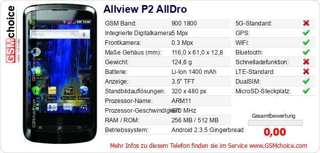 Hast du eigene Webseite? Willst du die Informationen über Standarddaten des Handys Allview P2 AllDro irgendwo veröffentlichen? Das ist sehr einfach. Du kannst das Bild herunterladen oder kopieren und auf der Webseite folgenden Code hinzufügen:Das Einfügen von diesem Code verursacht das Anzeigen von dem folgenden Bild: