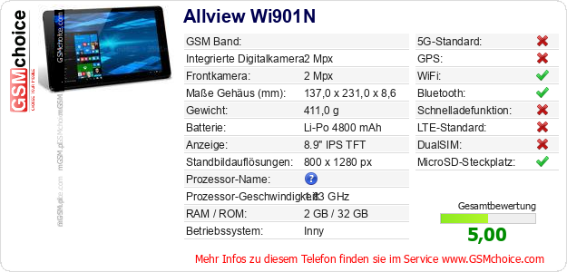 Hast du eigene Webseite? Willst du die Informationen über Standarddaten des Handys Allview Wi901N irgendwo veröffentlichen? Das ist sehr einfach. Du kannst das Bild herunterladen oder kopieren und auf der Webseite folgenden Code hinzufügen:Das Einfügen von diesem Code verursacht das Anzeigen von dem folgenden Bild: