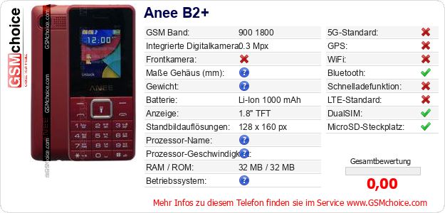 Hast du eigene Webseite? Willst du die Informationen über Standarddaten des Handys Anee B2+ irgendwo veröffentlichen? Das ist sehr einfach. Du kannst das Bild herunterladen oder kopieren und auf der Webseite folgenden Code hinzufügen:Das Einfügen von diesem Code verursacht das Anzeigen von dem folgenden Bild:
