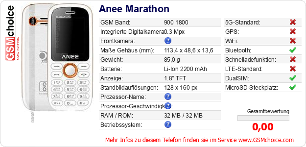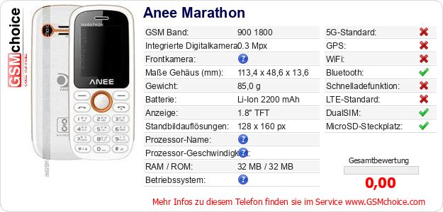Hast du eigene Webseite? Willst du die Informationen über Standarddaten des Handys Anee Marathon irgendwo veröffentlichen? Das ist sehr einfach. Du kannst das Bild herunterladen oder kopieren und auf der Webseite folgenden Code hinzufügen:Das Einfügen von diesem Code verursacht das Anzeigen von dem folgenden Bild: