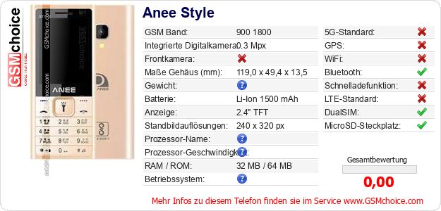 Hast du eigene Webseite? Willst du die Informationen über Standarddaten des Handys Anee Style irgendwo veröffentlichen? Das ist sehr einfach. Du kannst das Bild herunterladen oder kopieren und auf der Webseite folgenden Code hinzufügen:Das Einfügen von diesem Code verursacht das Anzeigen von dem folgenden Bild: